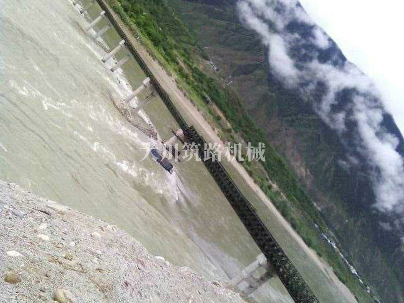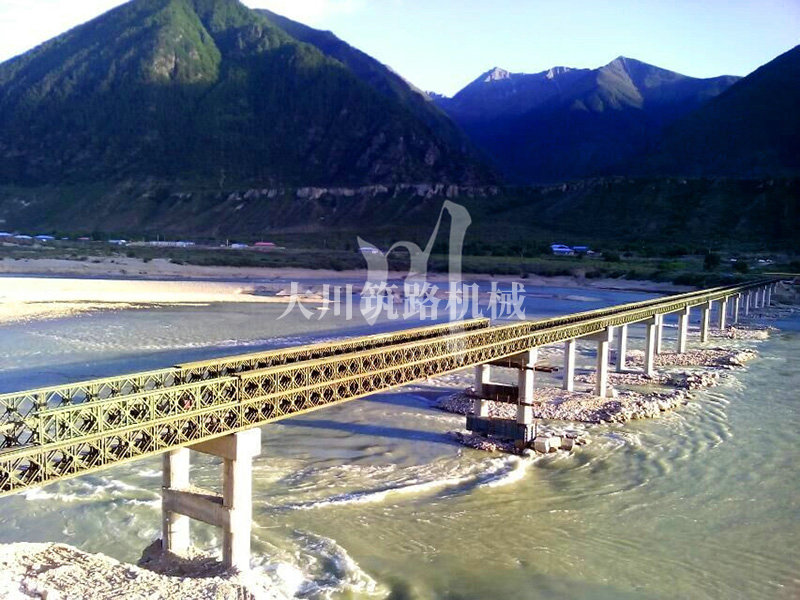 特點(diǎn):本鋼橋拉薩到林芝鐵路控制性工程的重要組成部分,滿足荷載80T施工車輛通行。主河道水流急,橋墩高,經(jīng)多方多次論證和設(shè)計(jì),最后采用了24+24+24+42+42+24M三排雙層單層混合型加強(qiáng)型雙橫梁下承式鋼橋??朔耸┕るy度大、氧氣較稀薄等因難因素,采用推出法安裝,于2015年6月通車。